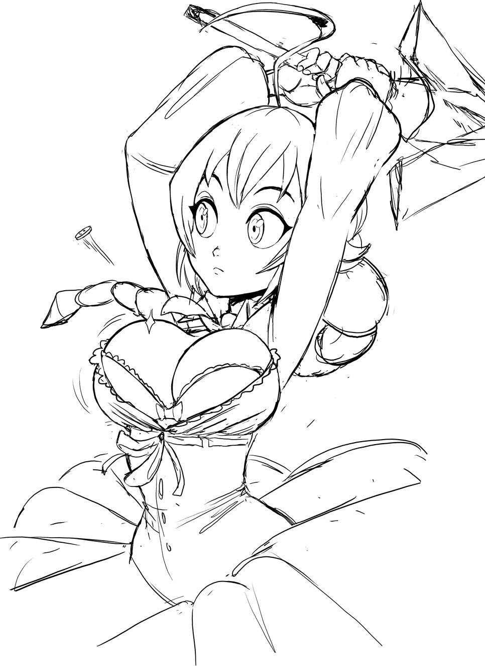 arms upbrabraidbraided ponytailbreastscleavagedressgreatswordhuge weaponlarge breastssketchswordunderwearwardrobe malfunctionweapon