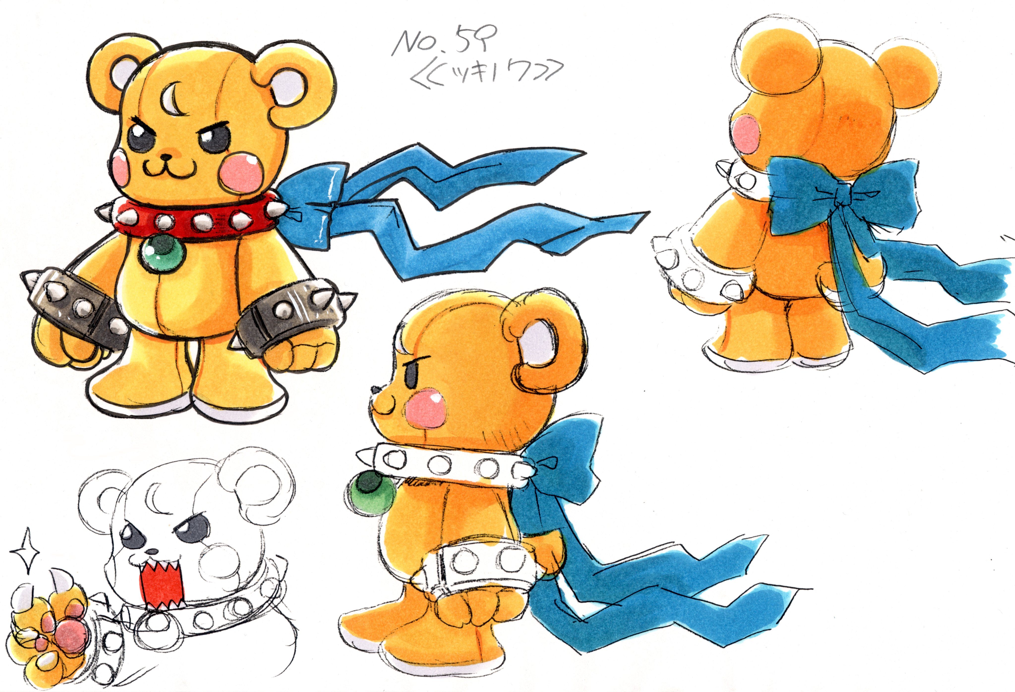 :3black eyesblue bowbowbraceletcharacter nameclawscollarcreaturecreature focusfrom behindfull bodygemgreen gemstonejewelrymultiple viewspawpadsreference sheetsharp teethsimple backgroundsolosparklespiked braceletspiked collarspikesstandingstuffed animalstuffed toyteddy bearteethtsuki no wav-shaped eyeswhite background