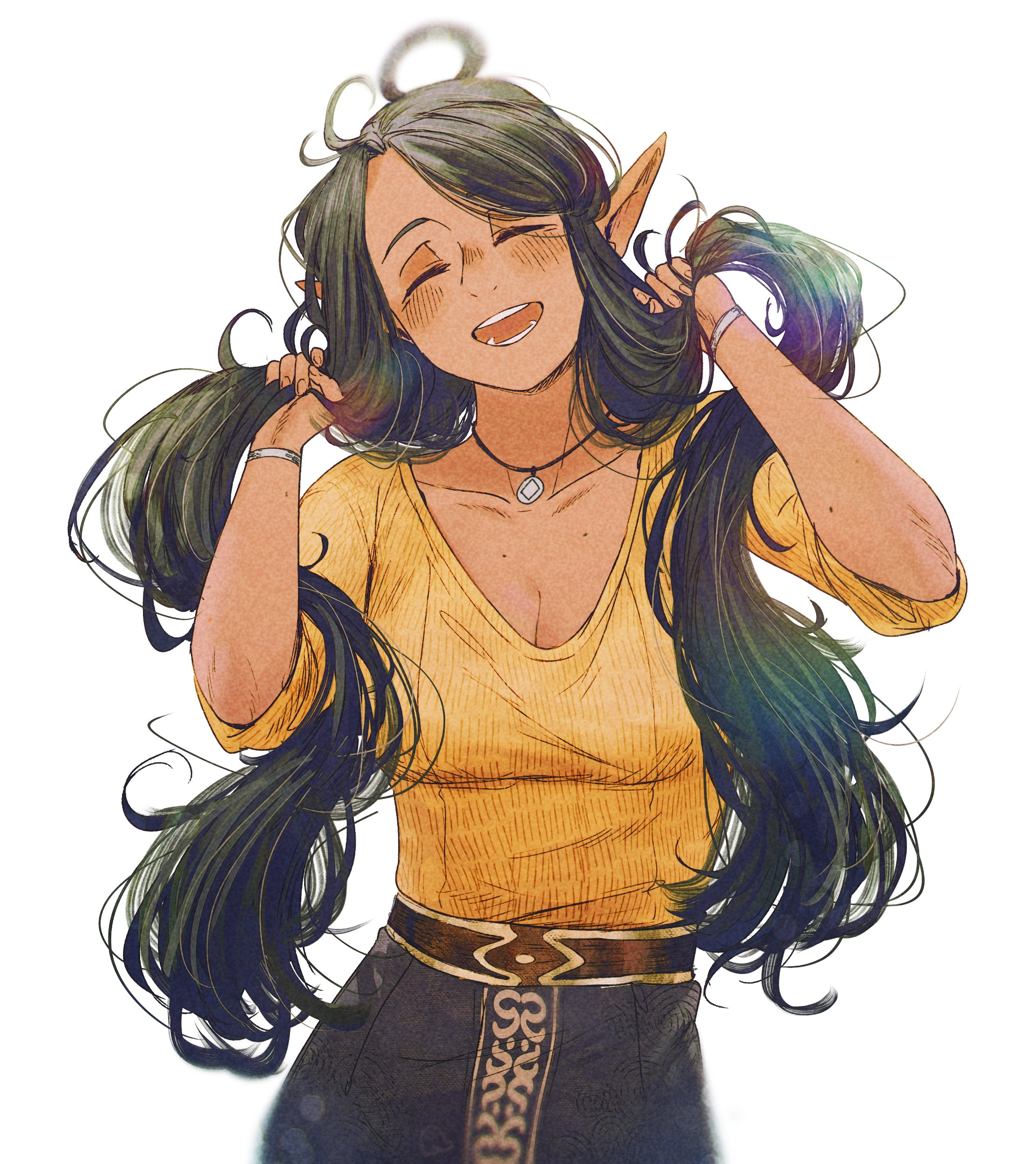 1girlblack hairblack pantsblushbreastscleavageclosed eyescowboy shothair ringsholdingholding own hairjewelrylong hairmedium breastsnecklaceopen mouthpantspointy earsshirtsingle hair ringsmilesolotherese (spindle (aidenr0))yellow shirt