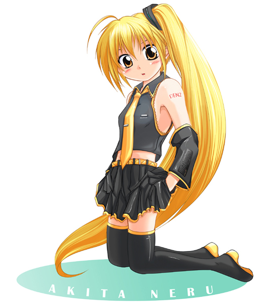 1girlblonde hairdetached sleevesfemale focuslong hairmidriffnecktieponytailskirtsolothighhighsyellow eyesyellow necktiezettai ryouiki