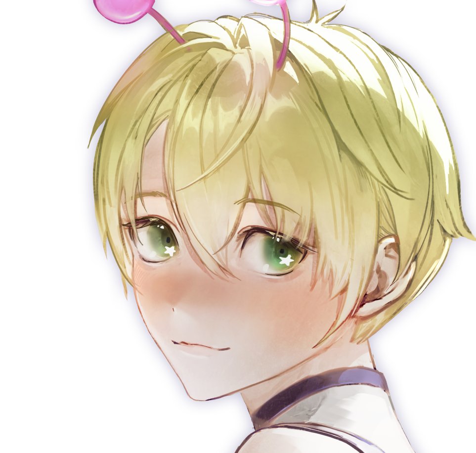 1girlalienantennaeblonde hairblushclose-upclosed mouthfrom sidegreen eyeshair between eyesleotardlooking at viewerlooking to the sideopenakinshort hairsolostar (symbol)star in eyesymbol in eyeturtleneckupper bodywhite backgroundwhite leotard