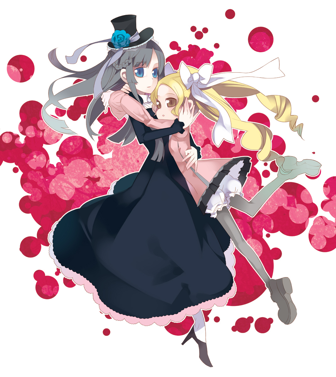 2girlsblack hairblonde hairbloomersblue eyesbrown eyesdressflowerhathuglong hairmultiple girlspantyhoseribbonrosesimple backgroundskirtunderwear