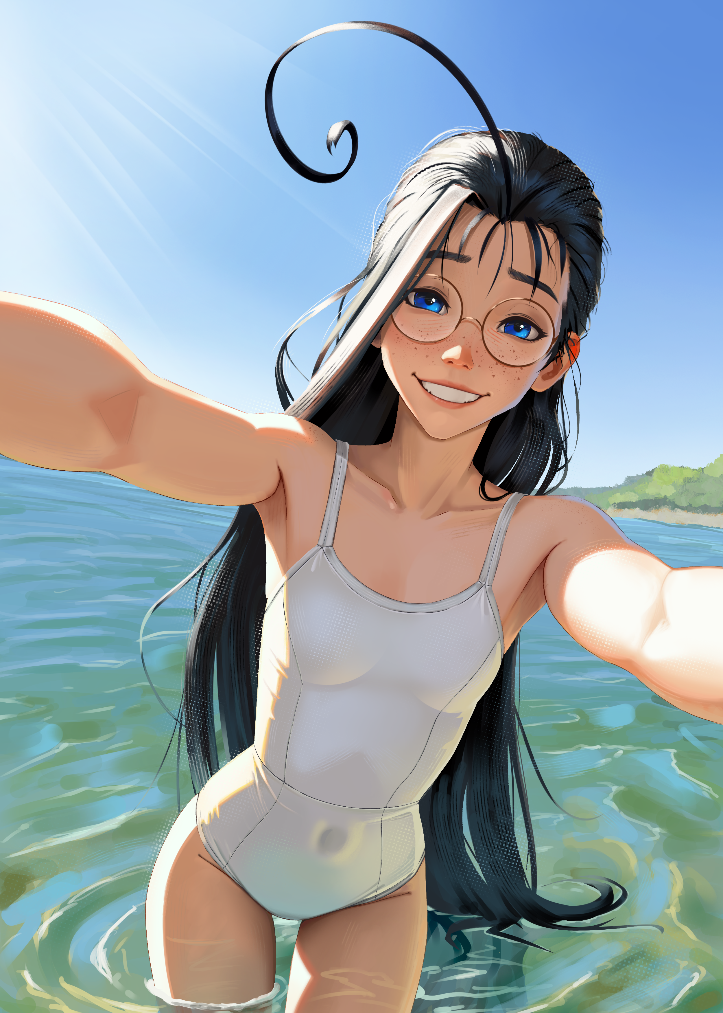 1girlahegaoblack hairblue eyesbreastsfrecklesglasseslong hairlooking at viewersmall breastssmileswimsuit