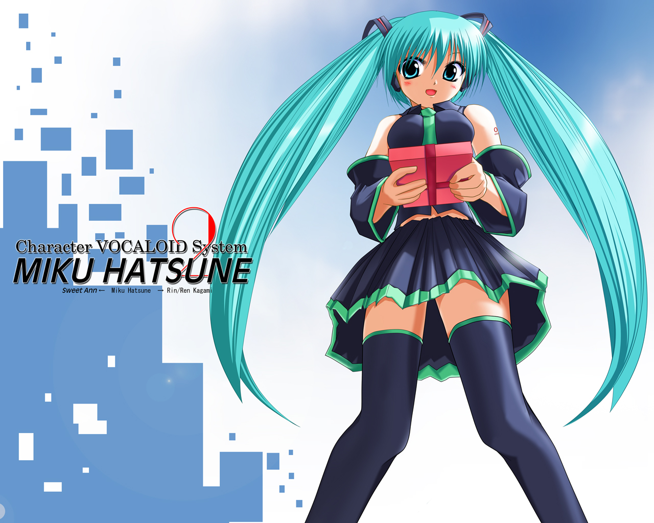1girlaqua eyesaqua hairdetached sleevesfemale focusgiftholdingholding giftlong hairskirtsolothighhighstwintailszettai ryouiki