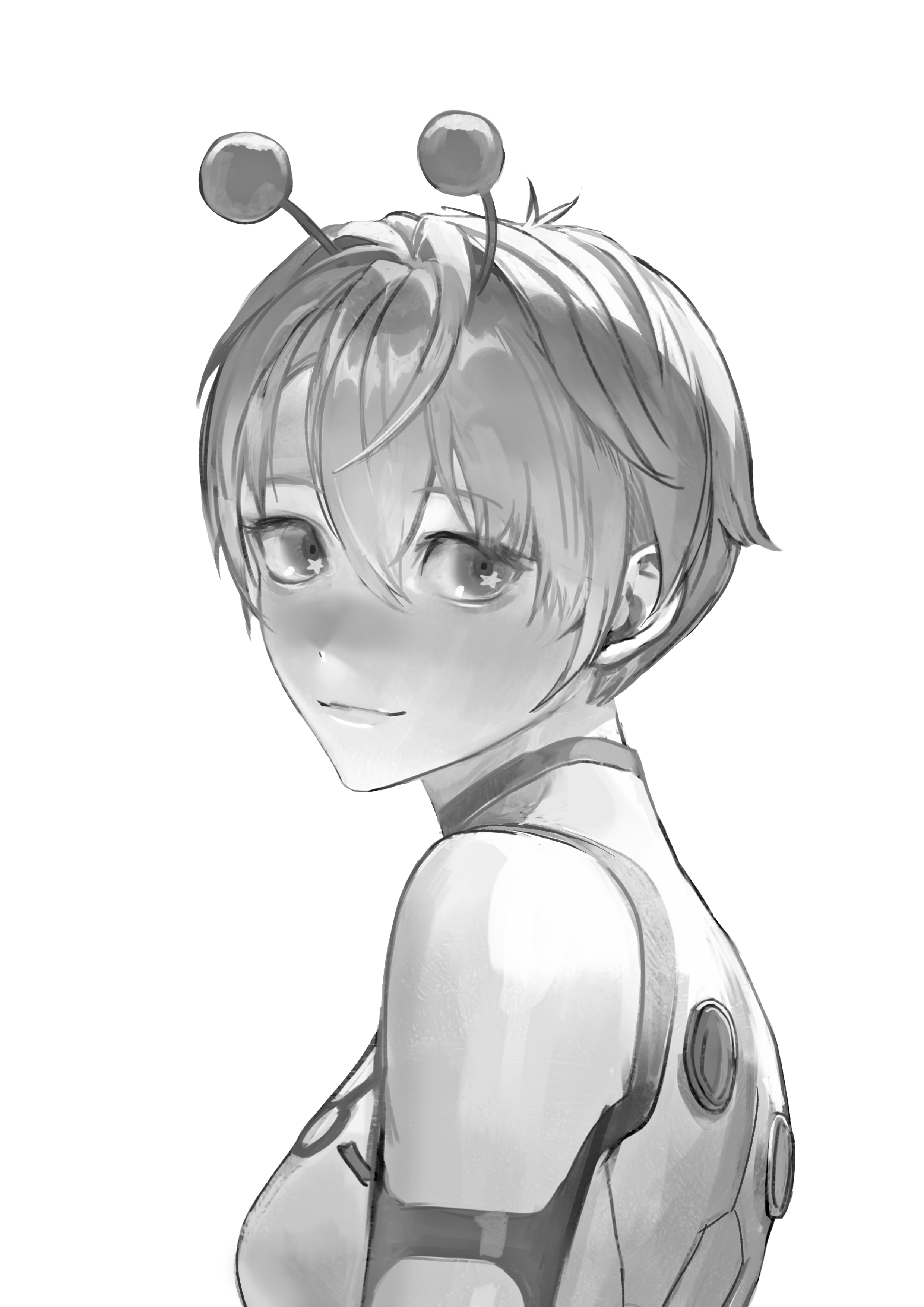 1girlalienantennaeblushbreastsclosed mouthfrom sidegreyscalehair between eyesheattech leotardleotardlooking at viewerlooking to the sidemedium breastsmonochromeopenakinshort hairsolostar (symbol)star in eyesymbol in eyeturtleneckupper bodywhite background