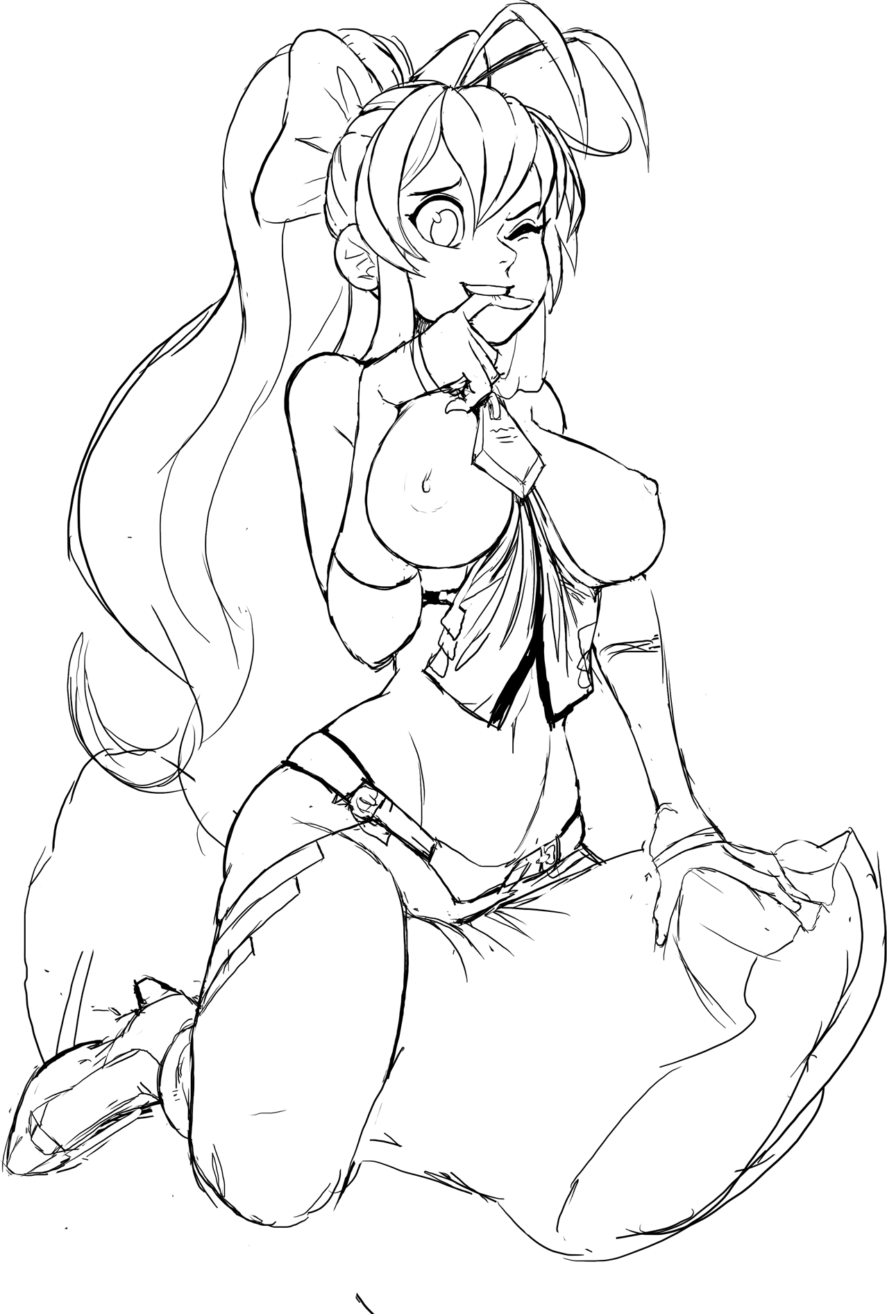 papatouch, changli (wuthering waves), wuthering waves, clothing request, commentary request, highres, 1girl, ahoge, alternate costume, animal ear hairband, animal ears, ascot, bare shoulders, black ascot, black choker, body markings, bow, braid, breasts, bug, butterfly, choker, cleavage, collar, colored extremities, detached collar, fake animal ears, fake tail, groin, hair between eyes, hair bow, hair extensions, hair intakes, hairband, index finger raised, insect, large breasts, long hair, looking at viewer, mole, mole on crotch, multicolored hair, navel, nontraditional playboy bunny, orange butterfly, parted lips, pink hair, rabbit ears, rabbit tail, red hands, red thighhighs, ring hair extensions, simple background, smile, solo, stomach, strapless, tacet mark (wuthering waves), tail, thighhighs, twin braids, two-tone hair, very long hair, white background, white bow, white collar, white hair, white wrist cuffs, wrist cuffs