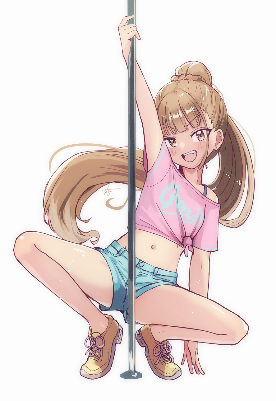 1girlbra strapdenimdenim shortsfanglong hairnavelorange eyesorange hairpolepole dancingshirtshoesshortssimple backgroundsneakerssolospread legsstripper polet-shirtthighstied shirt