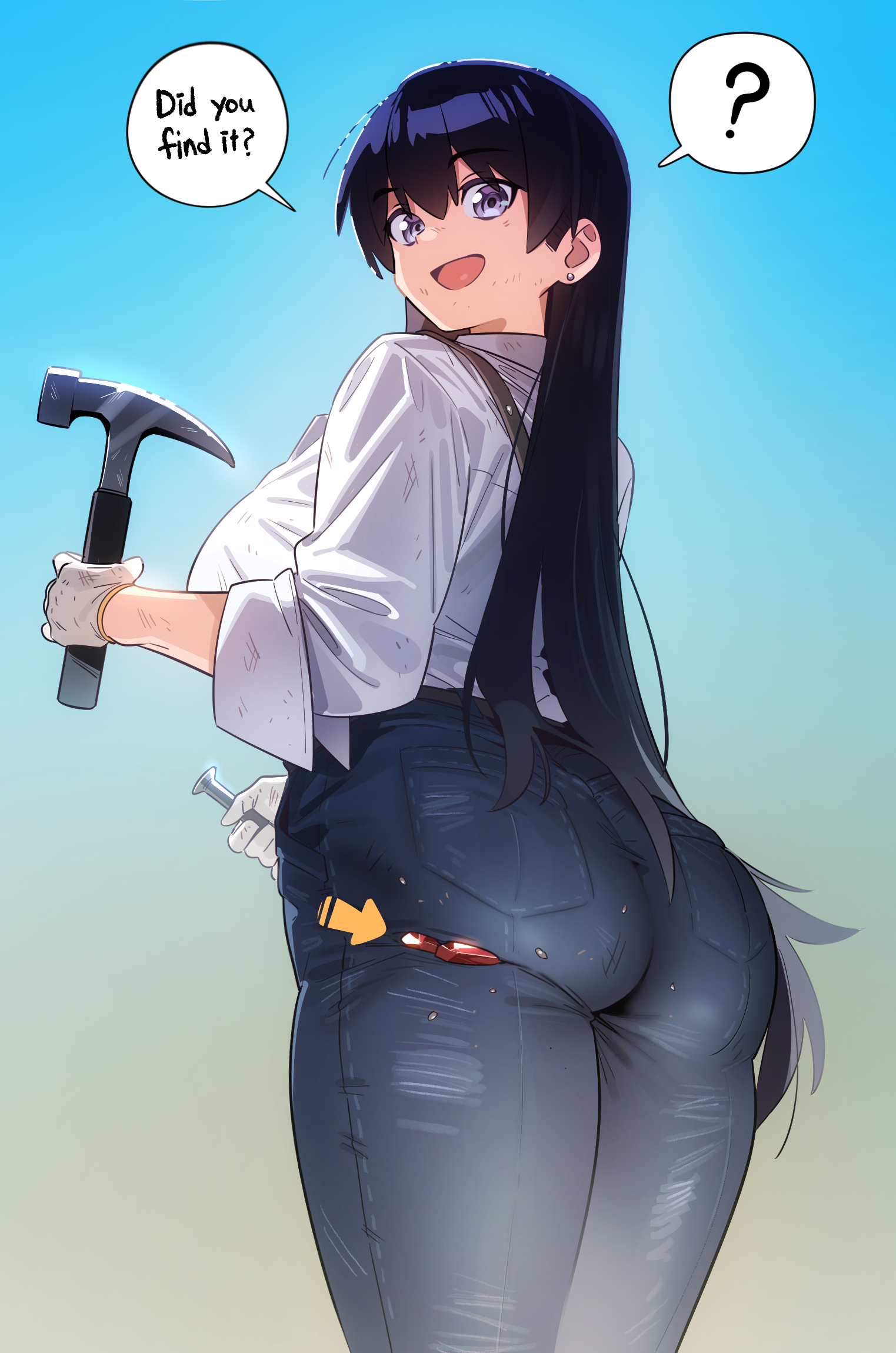 arrow (symbol)assblack eyesblack hairbreastsdenimearringsgemglovesgradient backgroundhammerholdingholding hammerjeansjewelrylarge breastslong hairlooking at vieweropen mouthpantsshirtsleeves rolled upsolospeech bubbletwo-tone backgroundwhite gloveswhite shirt