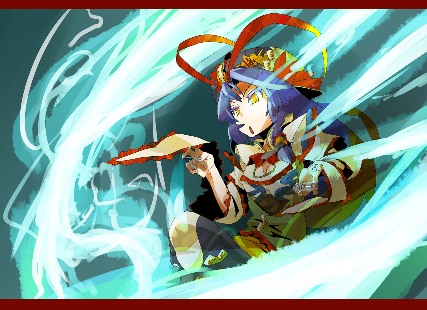 keiji asakawa, light, 1girl, autumn, blue hair, cloud, day, dress, female focus, forest, hat, letterboxed, nature, scenery, sky, solo, sun