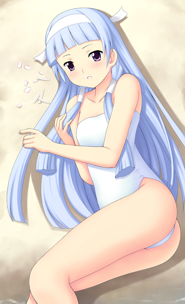 00sblue hairblunt bangshairbandlong hairlyingon sideone-piece swimsuitpurple eyessandsoloswimsuit