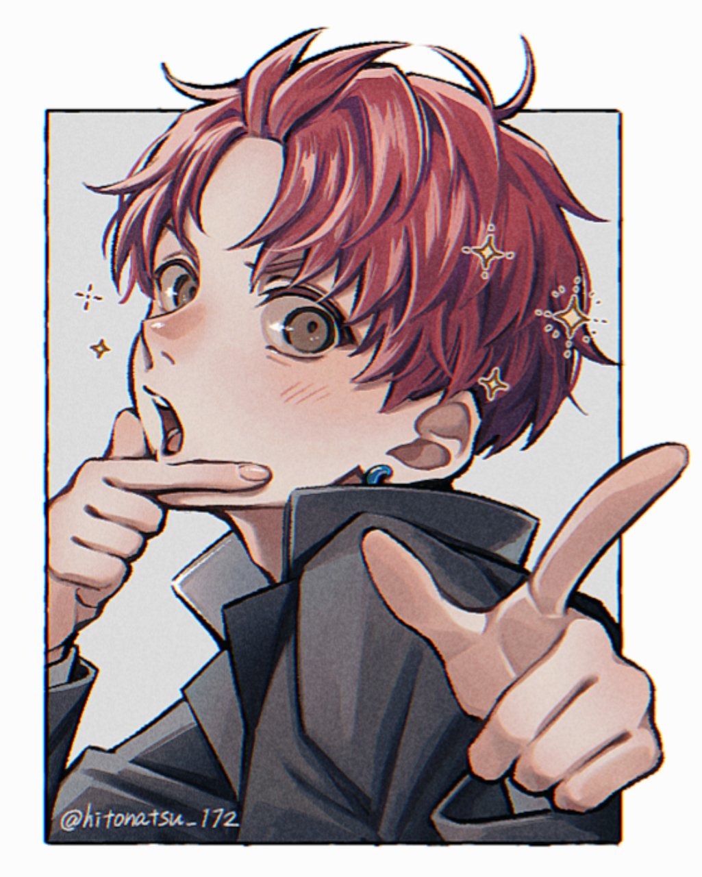 1boyblack jacketblushborderbrown eyesearringsfrom sidegakuranhand on own chinhitonatsu 172jacketjewelrykami high school uniformlong sleeveslooking at viewermale focusopen mouthoutside borderpointingpointing at viewerred hairschool uniformshort hairsolosparkletwitter usernameupper bodywhite border