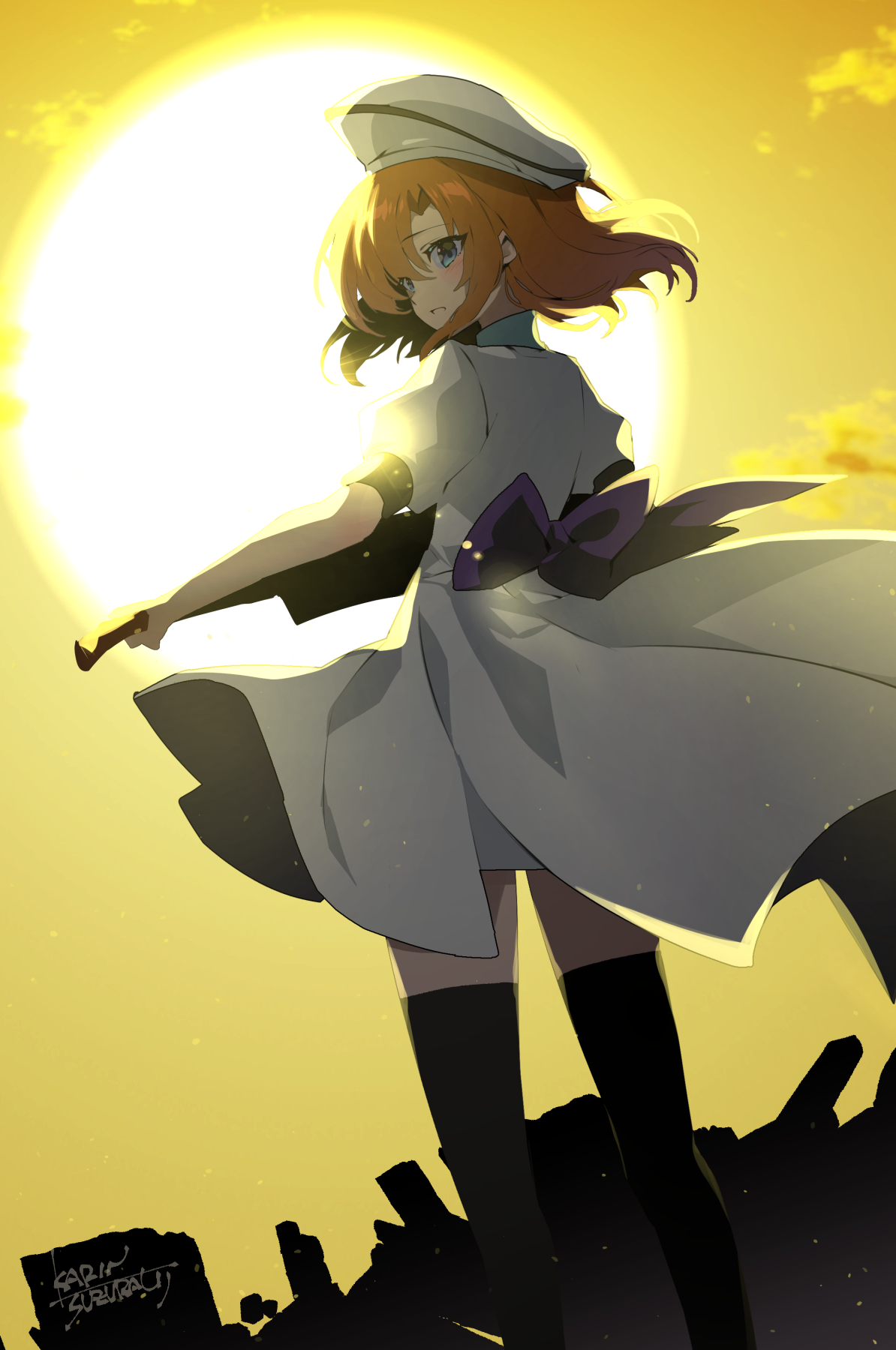 beni-enma, beni-enma (first ascension), fate/grand order, fate (series), absurdres, highres, 1girl, apron, ass, bird hat, blush, breasts, brown hat, feather trim, hat, japanese clothes, kimono, long hair, long sleeves, looking at viewer, looking back, low ponytail, open mouth, parted bangs, platform sandals, ponytail, red eyes, red hair, red kimono, sandals, small breasts, smile, socks, solo, thighs, very long hair, white apron, wide sleeves, zasyuu 11