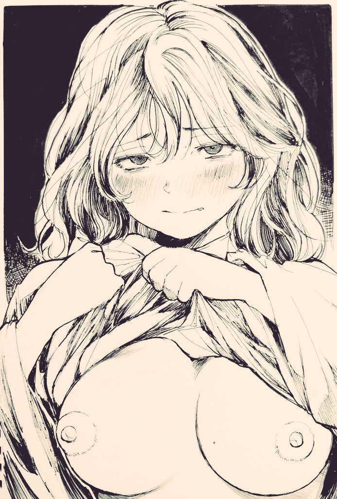 1girlblack backgroundblushbreastsclenched teethembarrassedfangfurrowed browlifting own clotheslong hairlooking at viewermedium breaststeethwavy hair