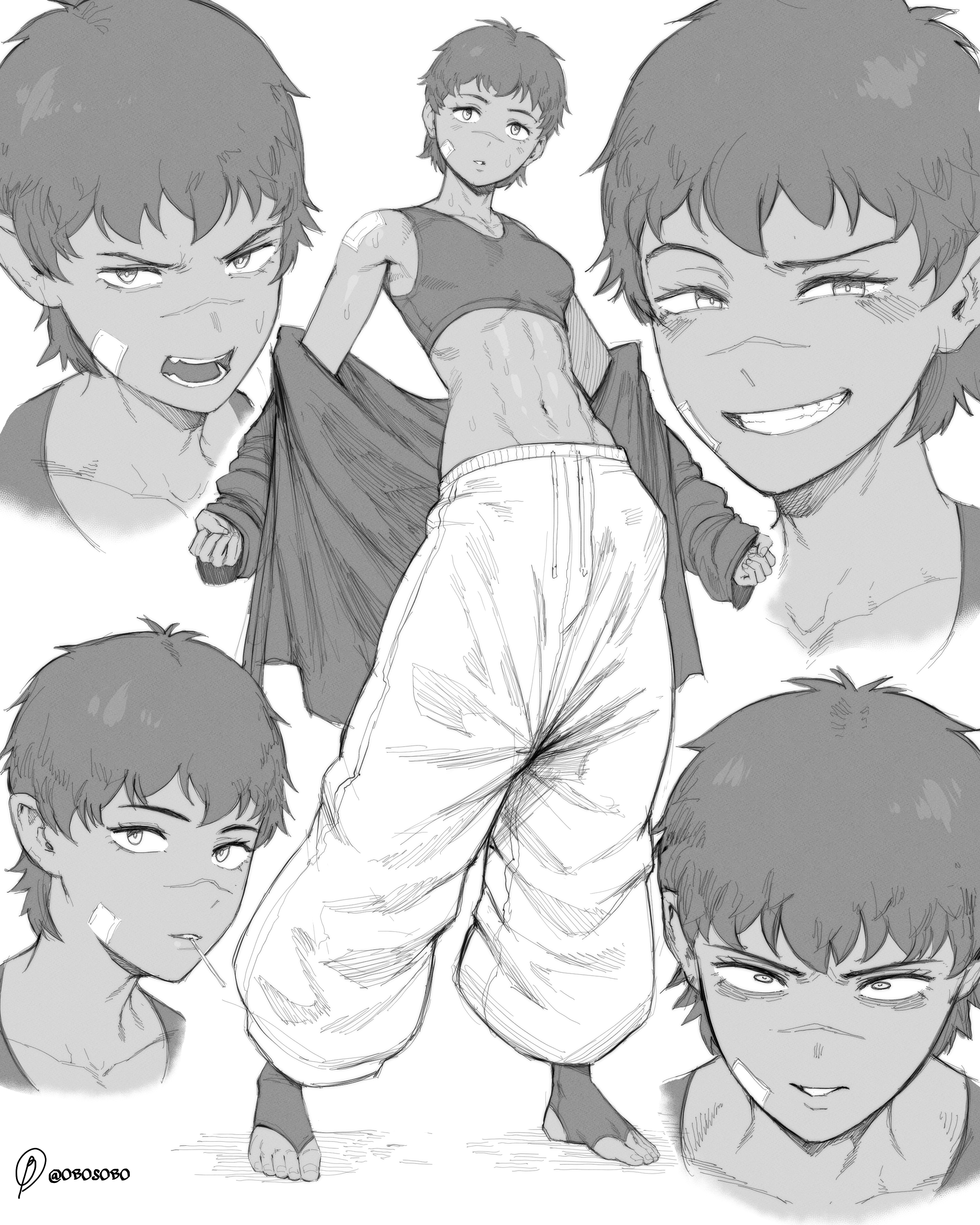 0bosoboabsartist namebreastsclenched teethcollarbonegauzegauze on cheekgauze on shouldergreyscalejacketlooking at viewermonochromemultiple viewsnavelopen clothesopen jacketopen mouthpantsscarscar on facescar on noseshort hairsports brasweatteethtoestomboytoothpicktwitter username