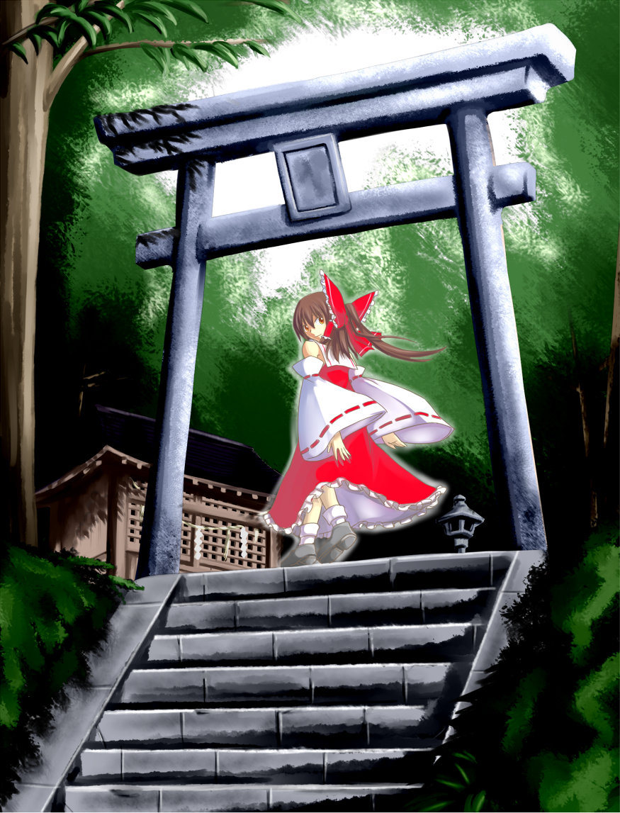 1girlbrown hairdetached sleevesfemale focusforestjapanese clothesmikonatureoutdoorsplantponytailribbonshrinesolostairsstone lanterntorii