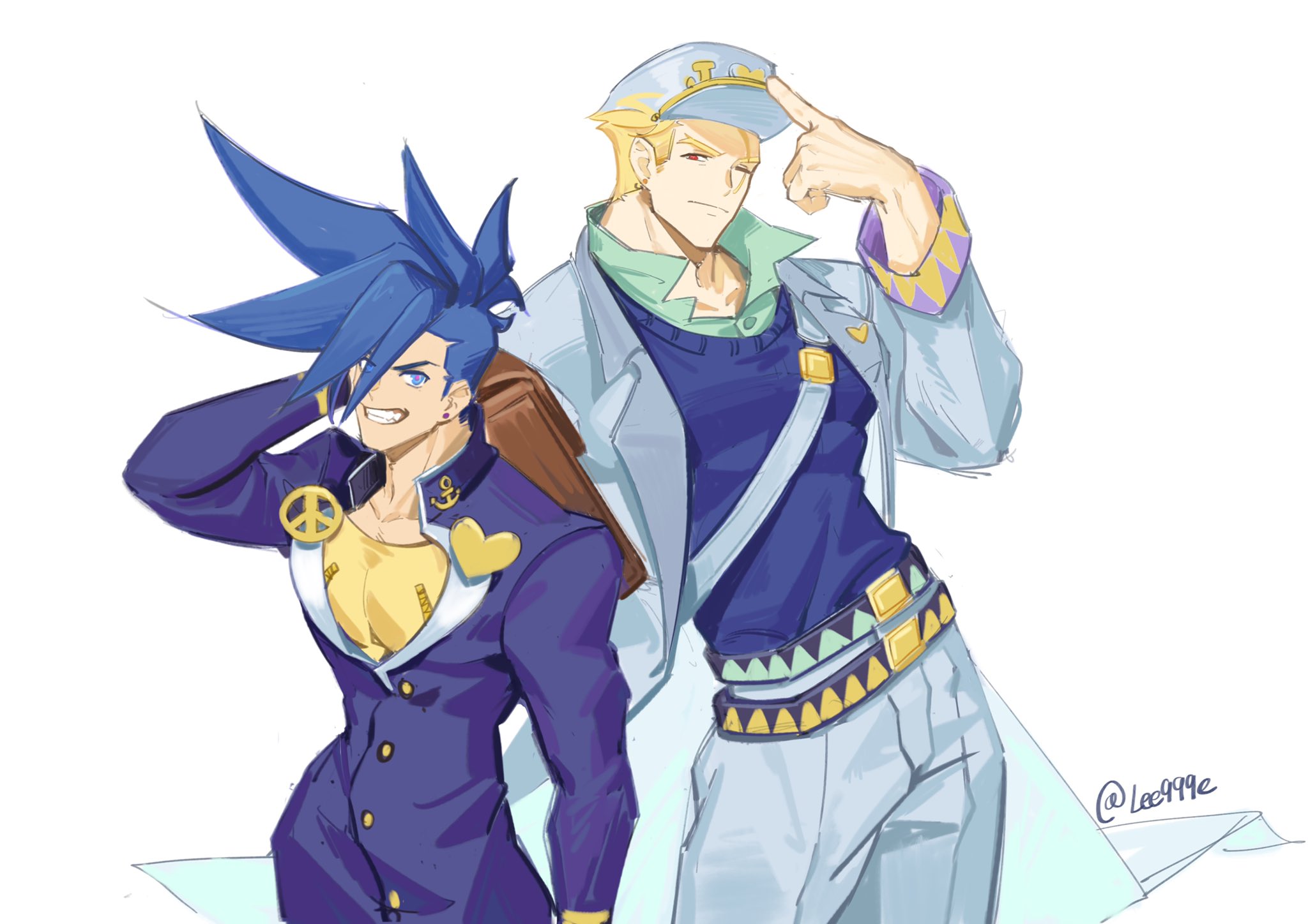 2boysanchor symbolasymmetrical hairbagbeltblonde hairblue eyesblue hairblue jacketblue sweaterbrown bagcoatcosplayearringsgakurangreen shirtgrinhathearthigashikata josuke (cosplay)holdingholding bagjacketjewelrykujo jotaro (cosplay)long coatmale focusmohawkmultiple beltsmultiple boysone eye closedpantspeace symbolred eyesschool uniformshirtshort hairsidecutsimple backgroundsmilespiked hairsweatertwitter usernametwo-tone beltundercutundershirtwhite backgroundwhite coatwhite hatwhite pantsyellow shirt