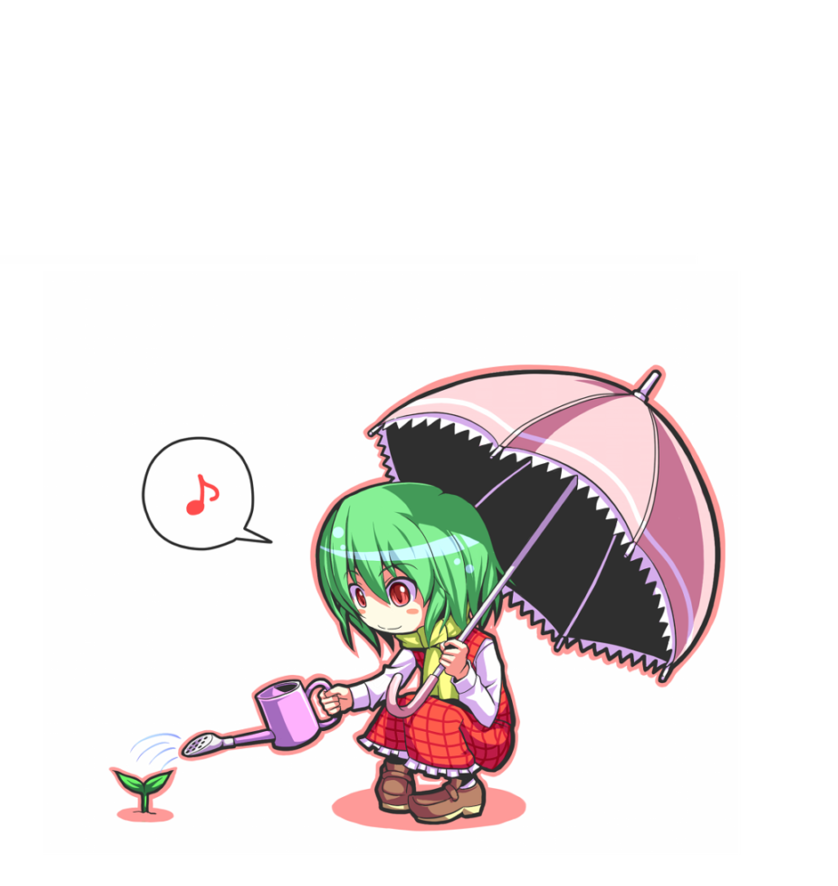 1girlascotblush stickerschibifemale focusfull bodygreen hairloafersmusical noteparasolplaid clothesplaid skirtplaid vestplantquaverred eyesscarfshoesshort hairsimple backgroundskirtskirt setsmilesolospeech bubblespoken musical notesquattingumbrellavestwatering canwhite background