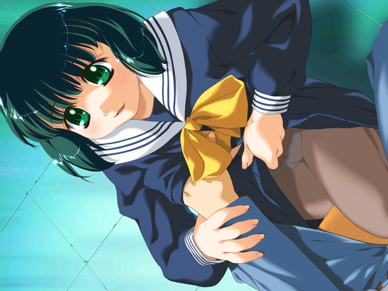 1girlclothes liftfemale focusgreen eyesgreen hairmatching hair/eyespantiespanties under pantyhosepantyhoseschool uniformskirtskirt liftsolounderwearupskirt