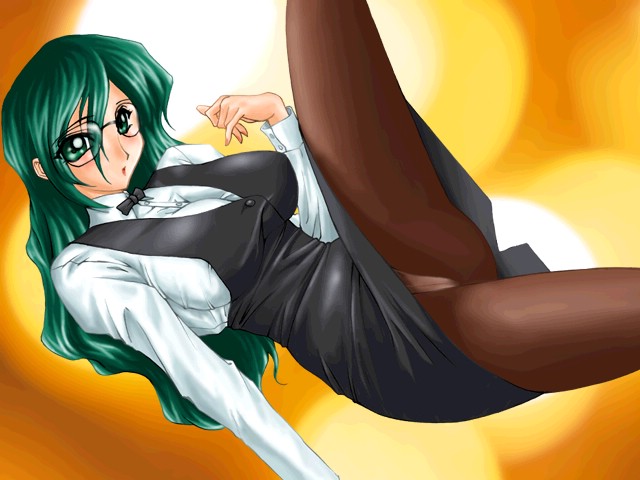 1girlblushfemale focusglassesgreen eyesgreen hairlong hairmatching hair/eyespantiespanties under pantyhosepantyhosepantyshotsolounderwearupskirt