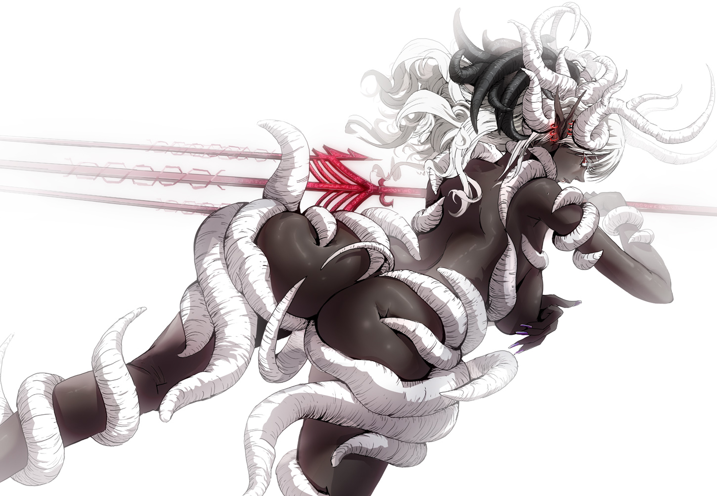 assbackdark skindark-skinned femalehornslong hairlooking backpointy earsred eyessoloswordweaponwhite hair