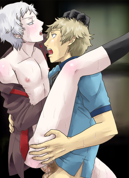 wa ichirou, allelujah haptism, soma peries, gundam, gundam 00, silver hair, translation request, 00s, 1boy, 1girl, :3, blush, couple, gloves, green hair, hetero, hug, middle finger