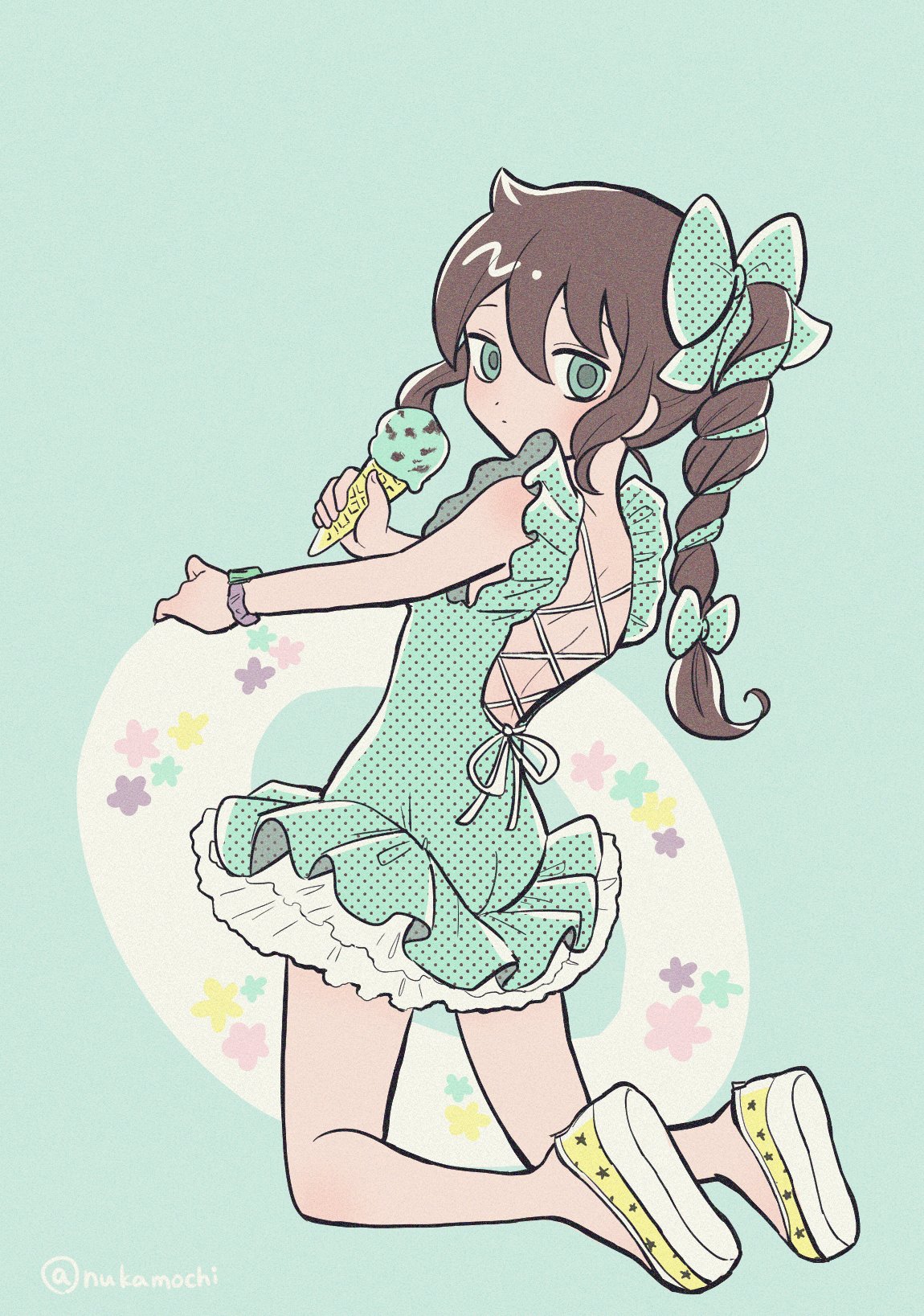 1girlalternate costumealternate hairstyleassbags under eyesblack hairbowclosed mouthdress swimsuitfoodfrom behindgreen backgroundgreen bowgreen eyesgreen one-piece swimsuitgrey scrunchiehair between eyeshair bowholdingholding foodholding ice creamholding ice cream coneholding swim ringice creamice cream coneinnertubekneelinglong hairlooking at viewerlooking backmint chocolateone-piece swimsuitpolka dotpolka dot bowpolka dot one-piece swimsuitponytailscrunchieshoessidelockssimple backgroundsoloswim ringswimsuittwitter usernameyellow shoes