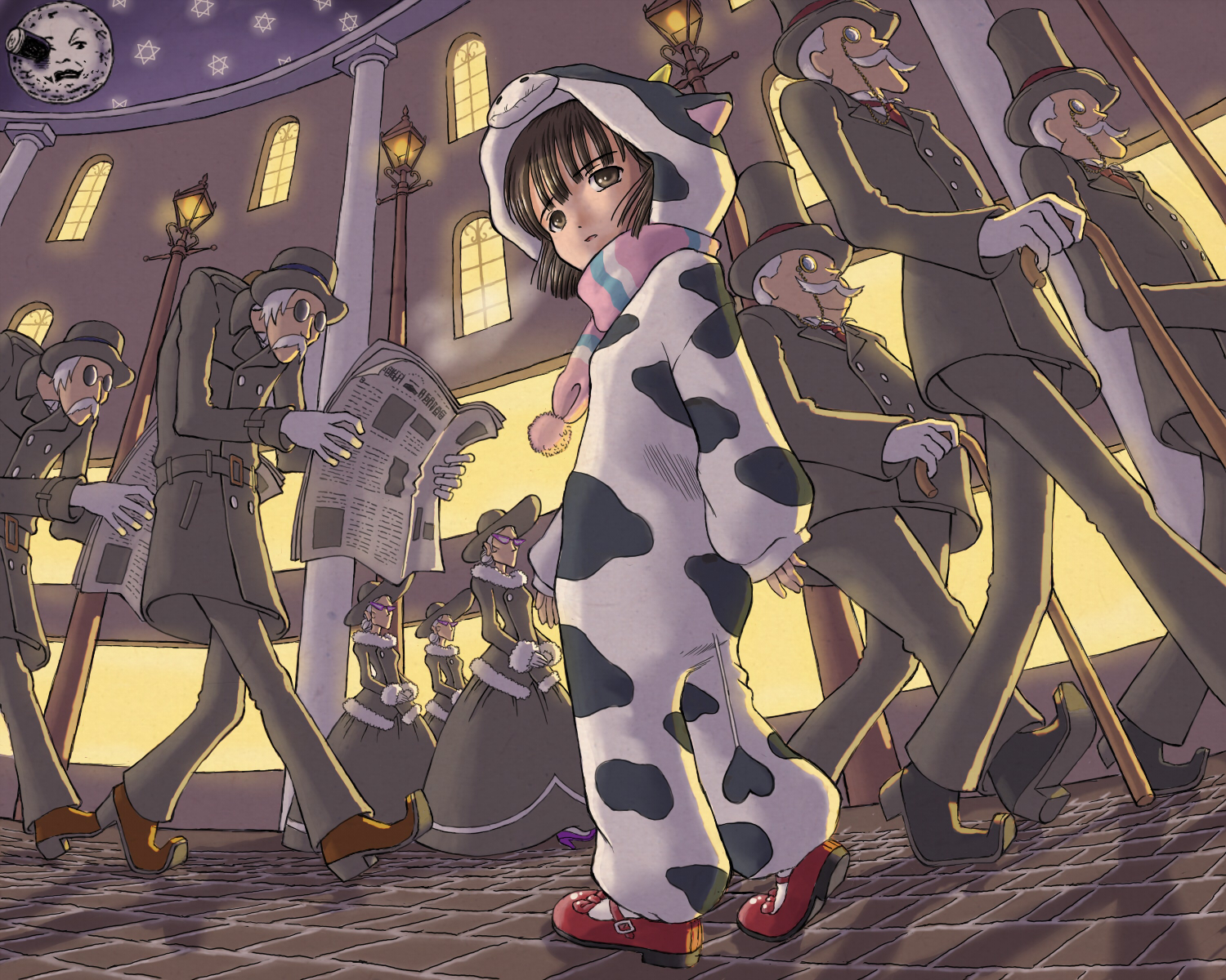 4girls6+boysanimal costumeanimal printbreathbrown eyesbrown haircanechildcow costumecow printdresseyewear strapfacial hairglassesgloveshathexagramhunchbacklamppostlooking backmary janesmonoclemonocle chainmoonmultiple boysmultiple girlsmustachenewspapernightoldold manold womanpajamaspavementscarfshoesstar (symbol)sunglassestop hatwalking