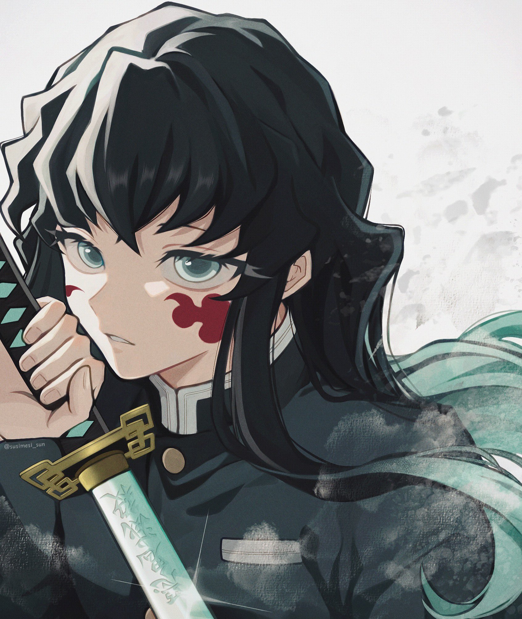 1boyaqua eyesaqua hairblood on cheekgold buttonsgradient hairhair between eyesholdingholding swordholding weaponkatanalong sidelockslooking at viewermale focusmulticolored hairsidelockssolosusimesi sunswordtwo-tone hairupper bodyweaponwhite background
