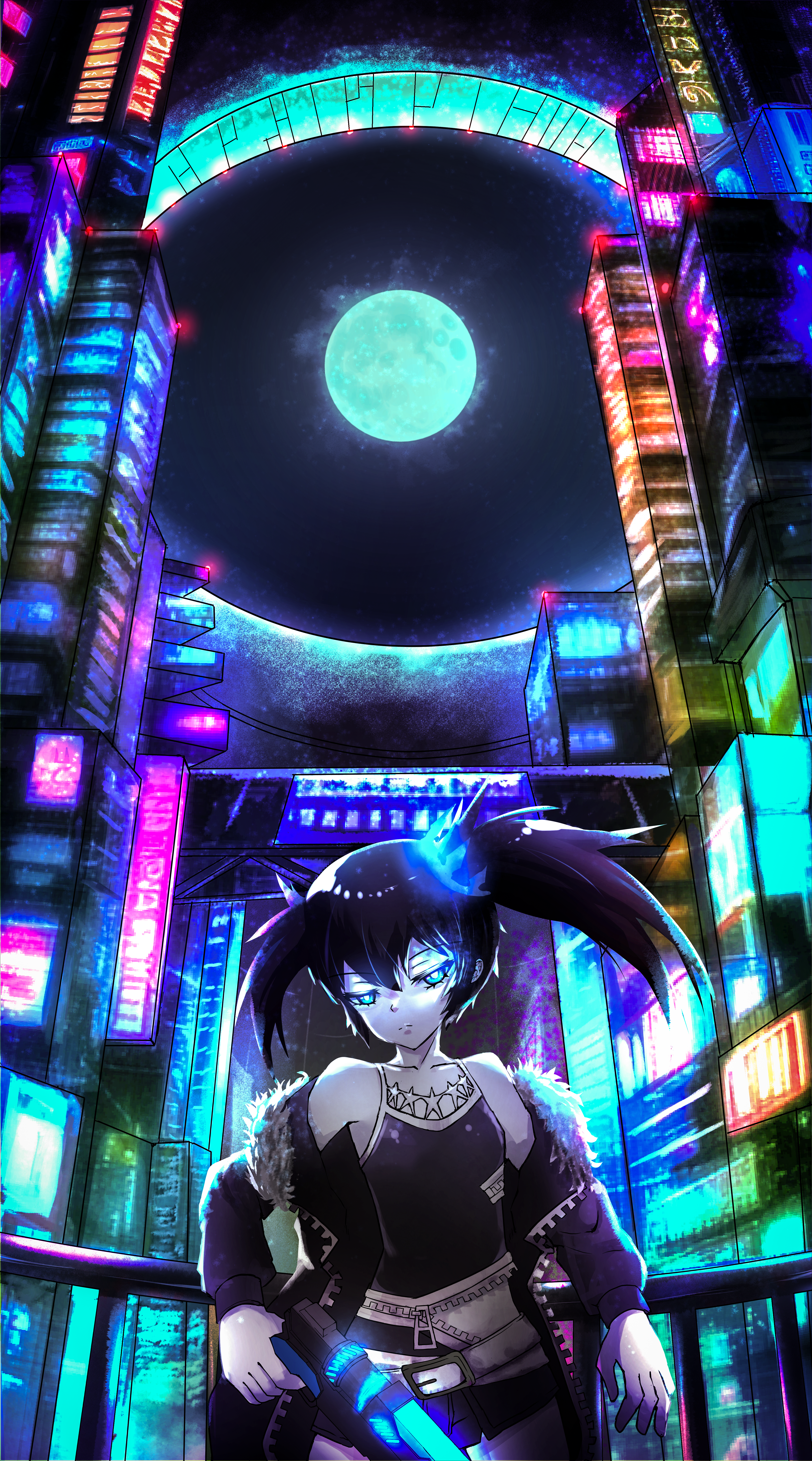 1girlbeltbelt skirtblack hairblack jacketblue crownblue eyescitycrownfur trimfur-trimmed jacketglowingglowing eyegunhandgunjacketmoonnightpale skinstitched cheststitched torsostitchestwintailsuneven twintailsweapon