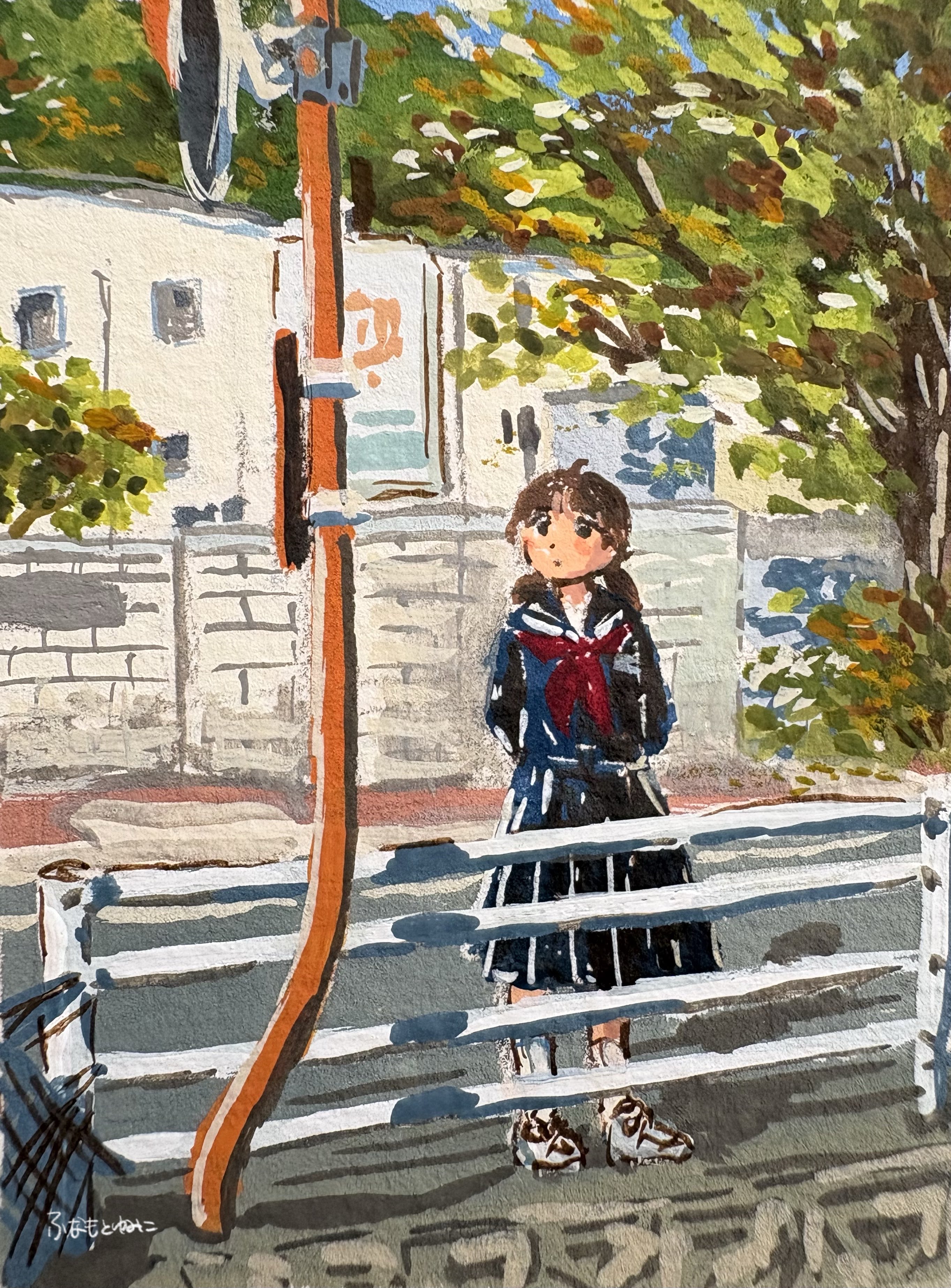 1girlbagblushbrown hairbuildingdateddaykneehighslooking at viewerneckerchiefoutdoorspleated skirtsailor collarschool uniformserafukusignatureskirtsockssolostandingtree
