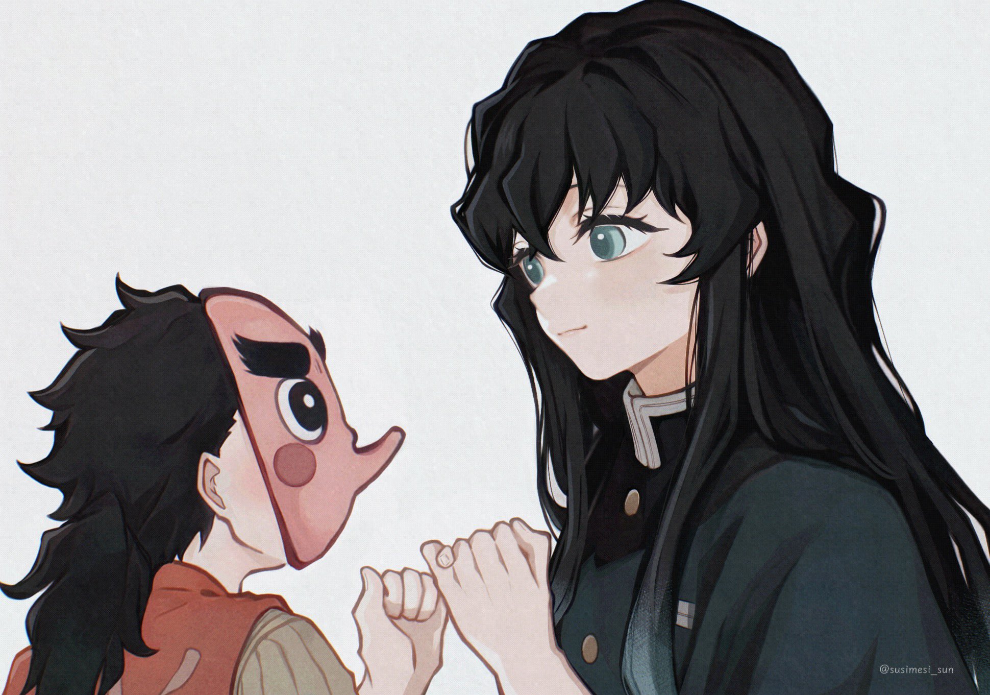 2boysaqua eyesblack jacketbuttonsclosed mouthdemon slayer uniformgold buttonsheight differencejacketlong hairlooking at anotherlow ponytailmale focusmaskmultiple boysponytailsimple backgroundsmilesusimesi suntwitter usernameupper bodyvery long hairwhite background