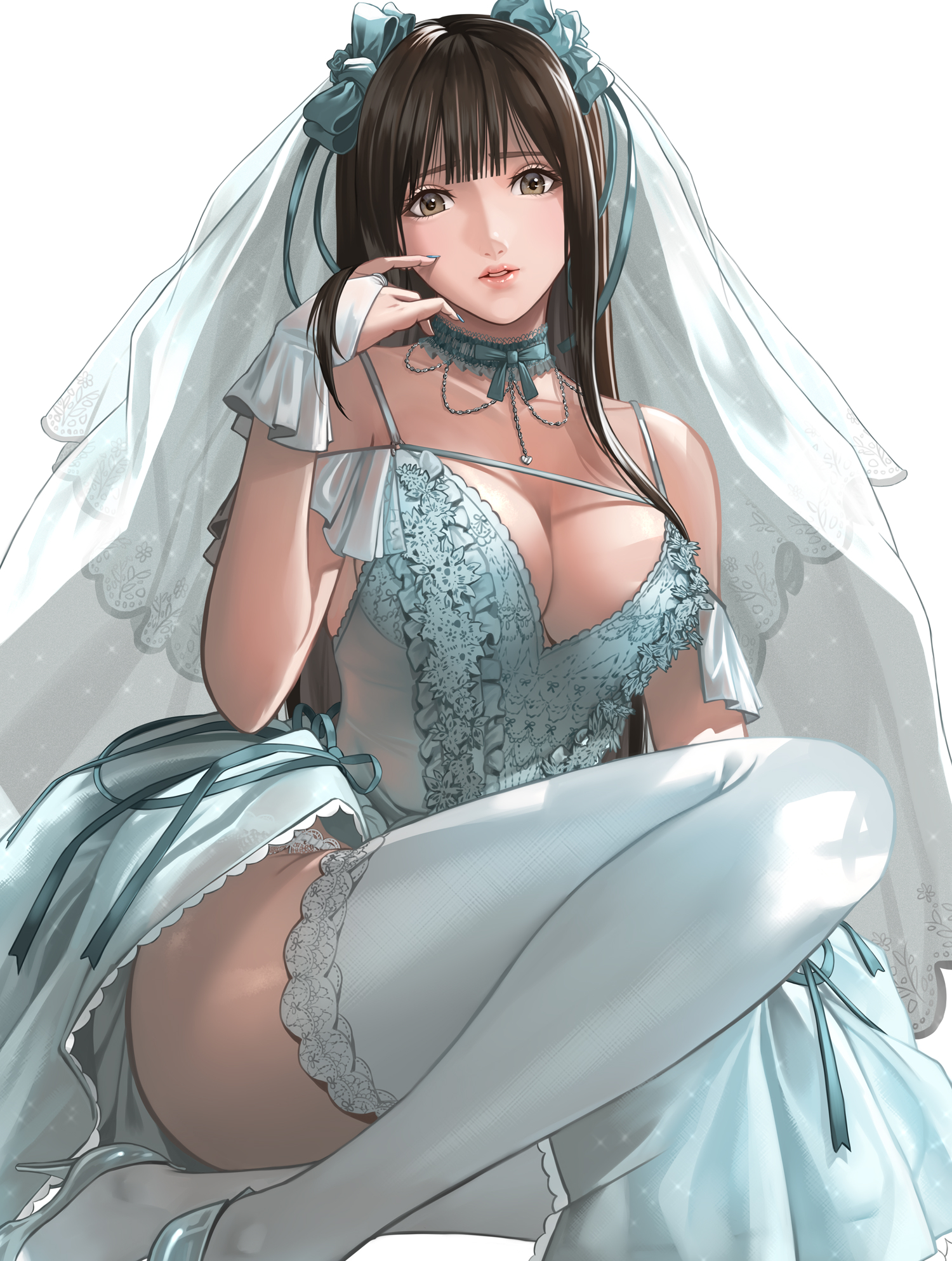1girlblack hairblue bowblue chokerblue dressbowbreastsbridal gauntletsbridal veilbrown eyeschainchain necklacechokercleavagedressfrilled glovesfrillsgloveshair bowhair lifthand upheartheart necklacehigh heelsjewelrylacelace trimlace-trimmed chokerlace-trimmed thighhighslarge breastsleg uplong hairlooking at viewernecklaceparted lipsshoessimple backgroundsittingsolothick thighsthighhighsthighsveilwedding dresswhite backgroundwhite gloveswhite shoeswhite thighhighszettai ryouiki