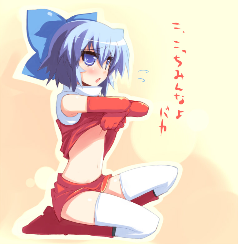 1girlalternate costumeblue eyesblue hairfemale focusfrom sidekneelingmatching hair/eyesribbonsanta costumeshort hairsolothighhighsundressingwhite thighhighs