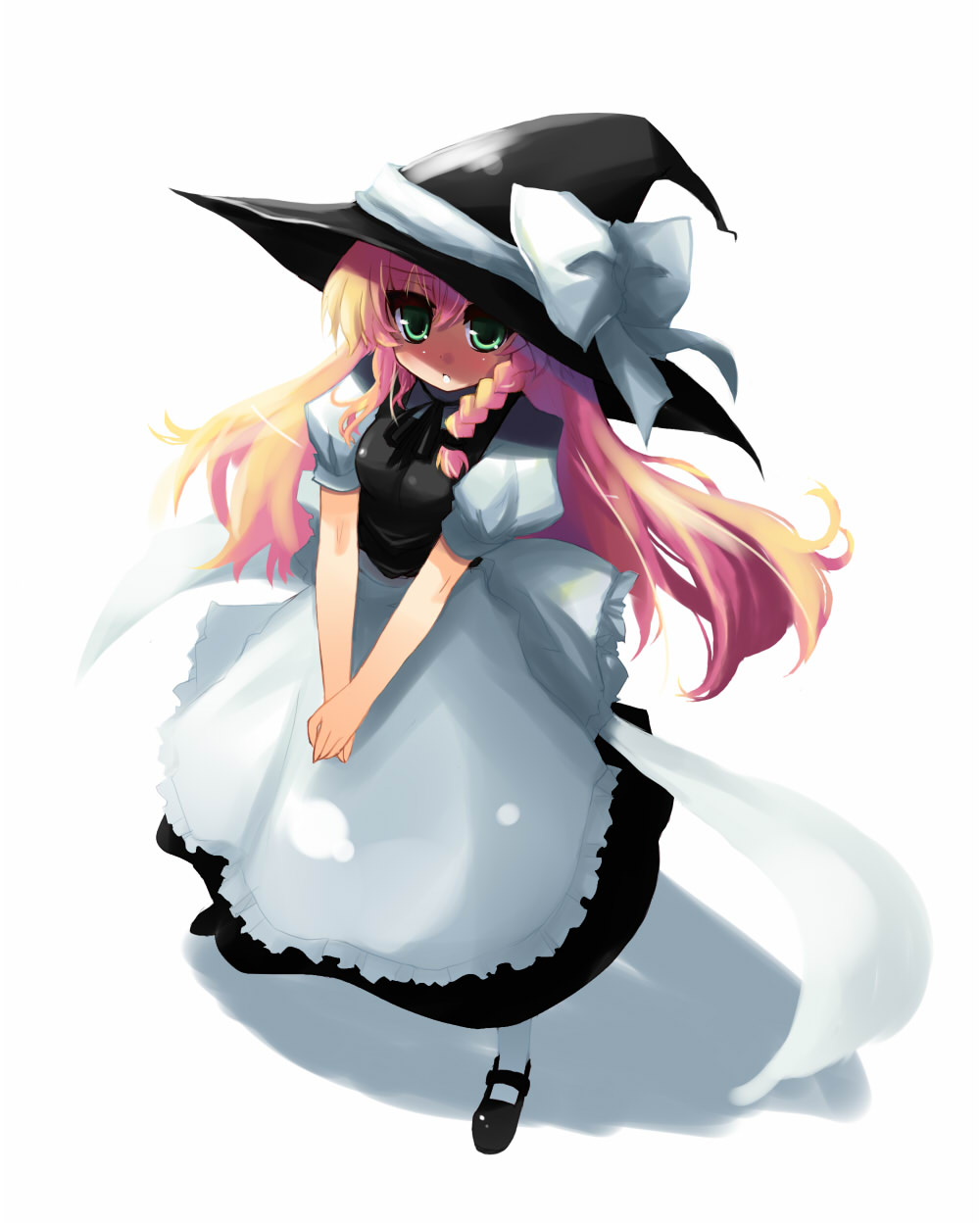 1girlapronblonde hairdressfemale focusfrom abovefull bodygreen eyeshatlong hairlooking upown hands claspedown hands togetherribbonsolowhite backgroundwitchwitch hat