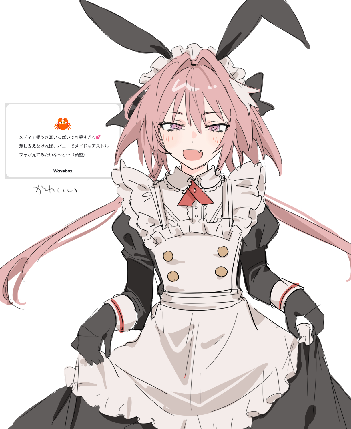 1boyanimal earsapronblack dressblack glovesblack ribbonblushbowcrossdressingcrossdressing (mtf)dressfangfrilled apronfrillsgloveshair between eyeshair bowhair intakeshair ribbonlong sleeveslooking at viewermaid apronmaid headdressmale focusopen mouthpink hairpulling own clothespurple eyesrabbit earsribbonshort hairsimple backgroundsketchskirt holdsolowhite apronwhite background