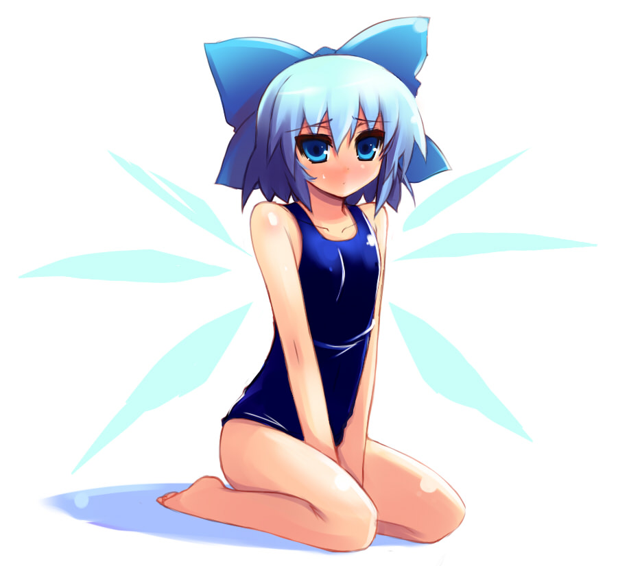 1girlbarefootblue eyesblue hairblushfemale focusmatching hair/eyesone-piece swimsuitribbonschool swimsuitshort hairsittingsoloswimsuitv armswarizawings