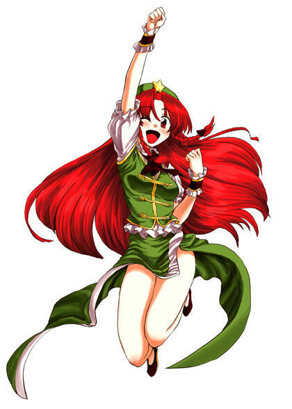 1girlbreastsfemale focusfull bodyhatlong hairone eye closedopen mouthred eyesred hairribbonsimple backgroundskirtsolowhite backgroundwink