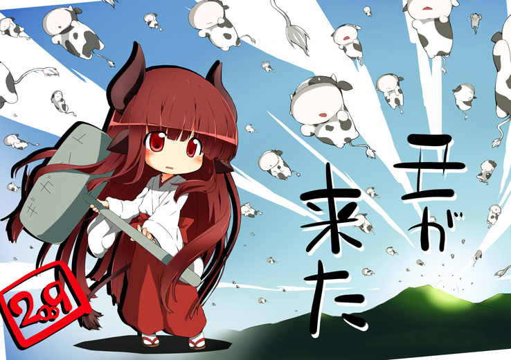 00s1girl2009blunt bangsbrown hairfemale focusfull bodyhakamahakama skirthammerjapanese clotheskimonolong sleeveslooking at viewermikonew yearred eyesred hakamaskirtsolostanding