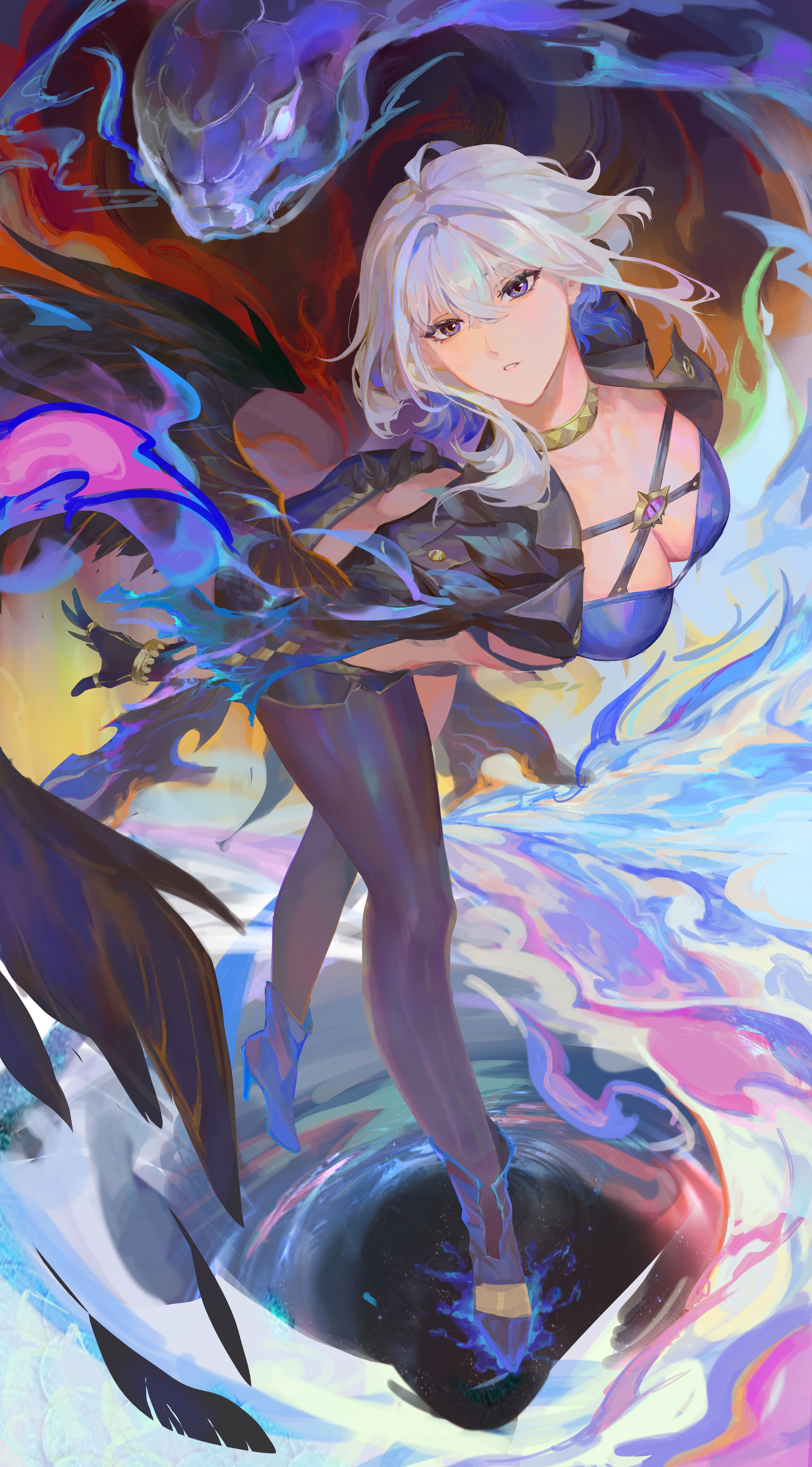 1girlblack jacketblack pantyhoseblack thighhighsblue brabrabreastscleavagegrey hairhair between eyesjacketleaning forwardlooking at viewermedium breastsmedium hairpantyhoseparted lipspurple eyessingle leg pantyhosesingle thighhighsolothighhighsunderwear