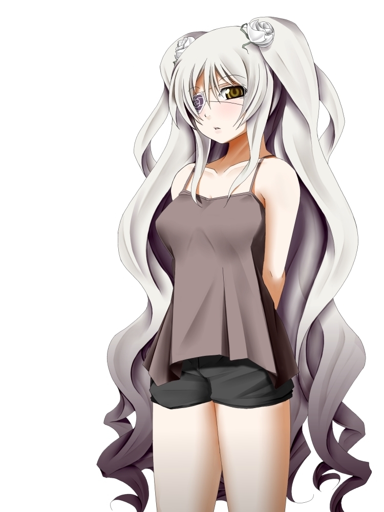 00saged uparms behind backbare shouldersbrown eyescamisoleeyepatchlong hairshortssolovery long hair