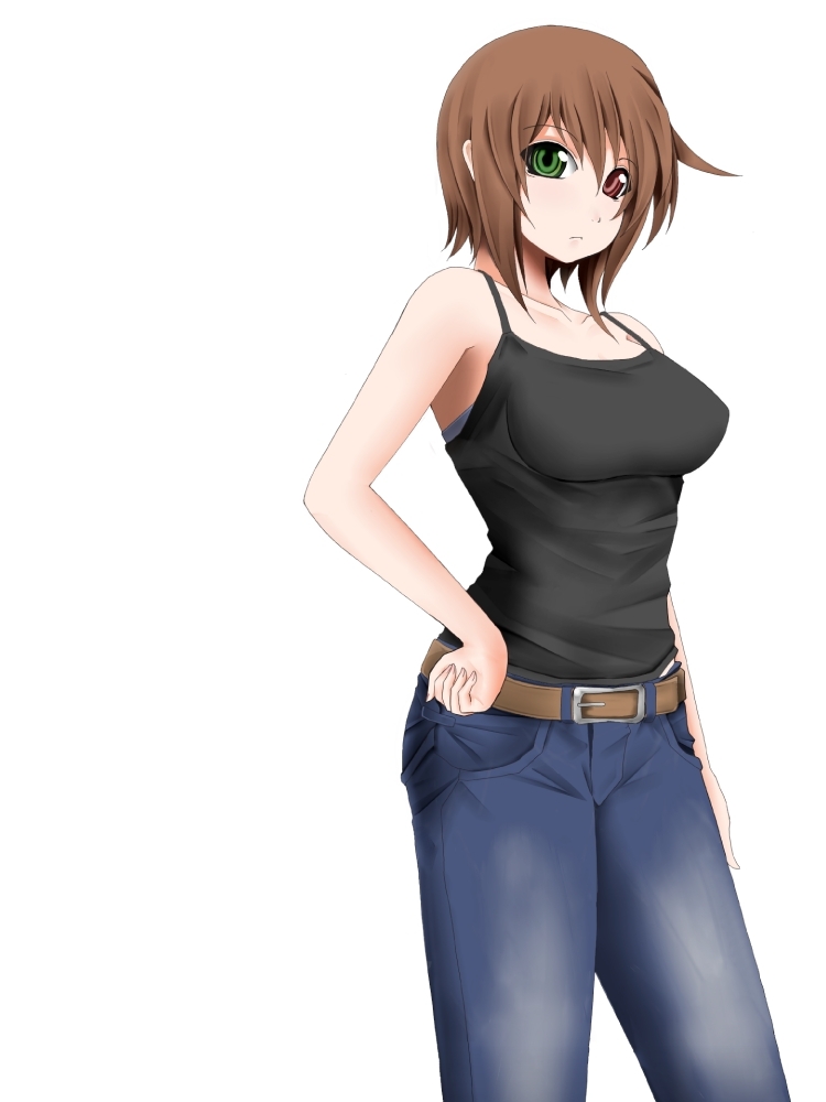 00saged upbare shouldersbeltbrown haircamisoledenimgreen eyeshand on own hiphands on own hipsheterochromiahip focusjeanspantsred eyesshort hairsolo