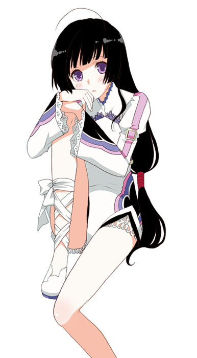 1girlahogeblack hairfemale focuslong hairlow-tied long hairpurple eyessimple backgroundsittingsolowhite background