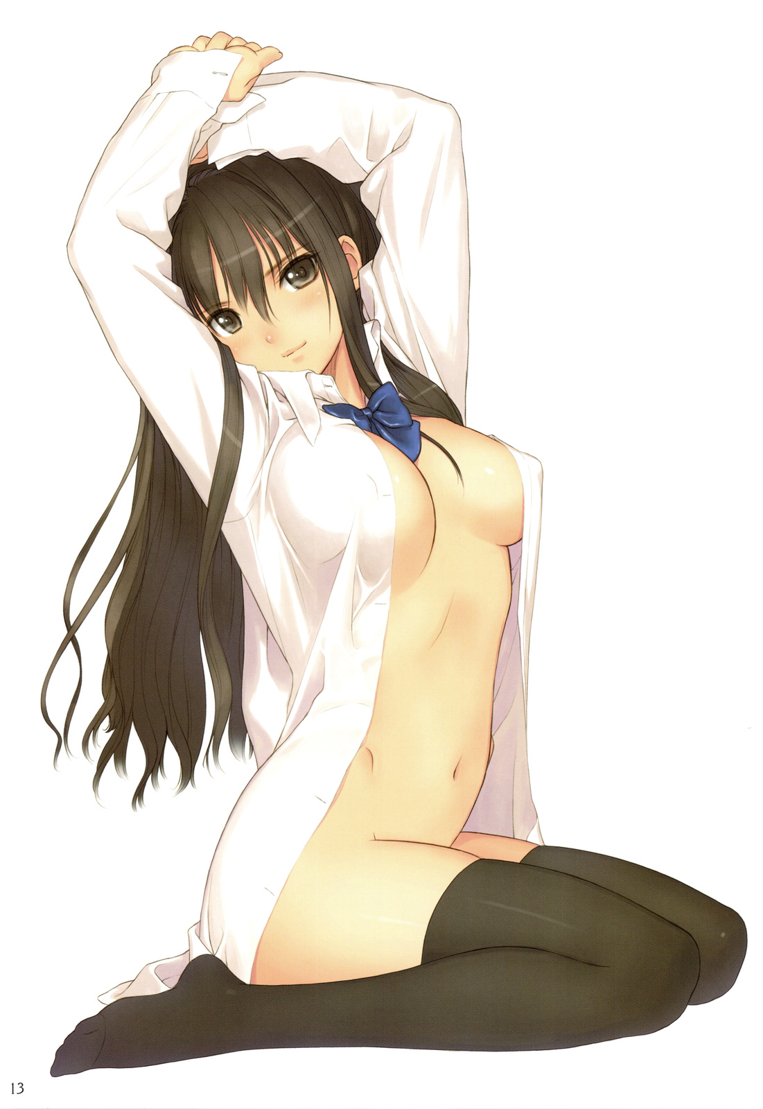 1girlarms upblack hairbottomlessbowbreastsdress shirtfemale focuslegslong hairlong legsnaked shirtnavelno brano pantiesopen clothesopen shirtshirtsimple backgroundsittingsmilesolothighhighsthighswhite shirt