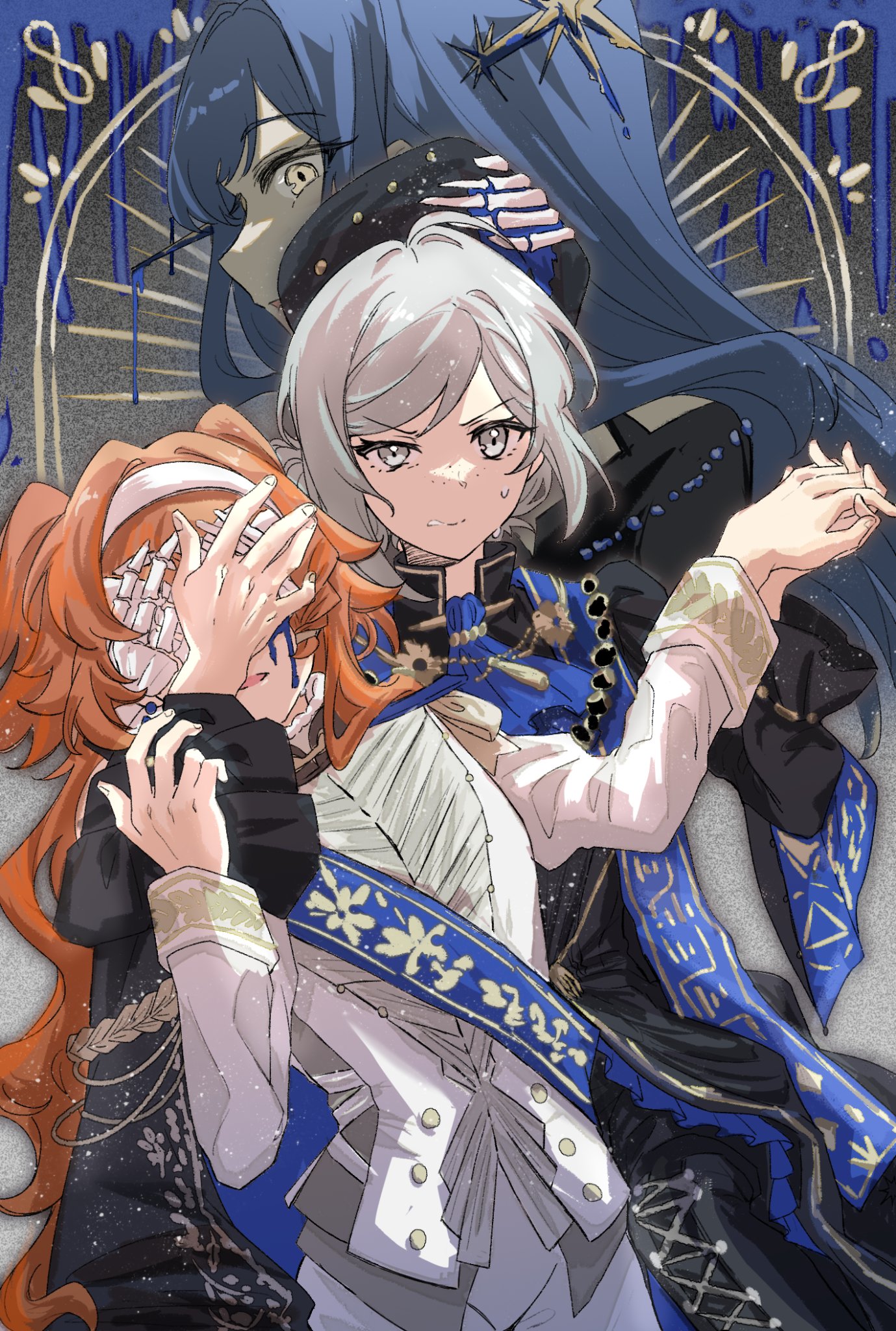 3girlsalternate costumeascotblack jacketblue ascotblue hairblue sashclenched teethcovering another's eyesfrecklesgrey backgroundgrey eyesgrey hairhair bunhairbandhands upholding handsinterlocked fingersjacketlong hairlooking at viewermultiple girlsparted lipssashshoulder sashsingle side bunsweatteethtwo side upupper bodywand in headwhite hairbandwhite jacketyellow eyes