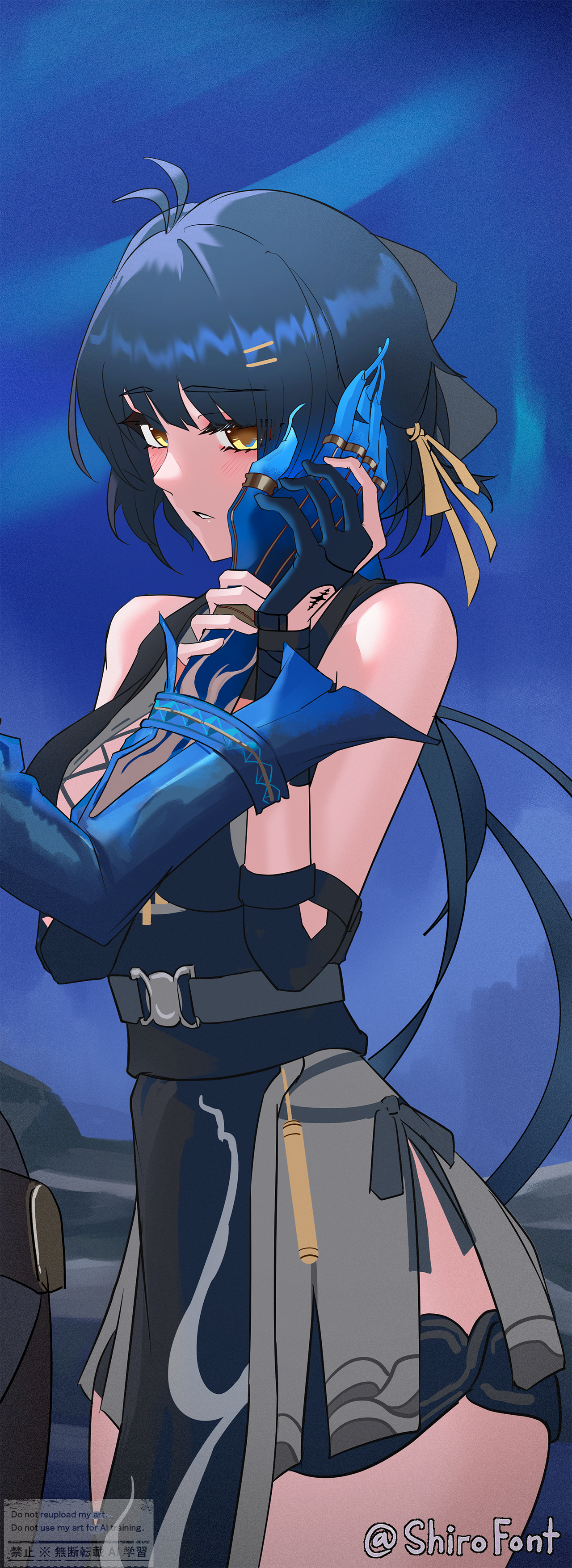 2girlsbare shouldersblack dressblack glovesblack hairblack shortsblue nailsbreastsdresselbow padsgloveshair ornamenthaircliphand on another's cheekhand on another's facelarge breastslight blushlong hairmultiple girlsmutationout of frameparallel hairclipsparted lipsshortssleevelesssleeveless dresssolo focustacet mark (wuthering waves)twitter usernamevery long fingernailswatermarkyellow eyes