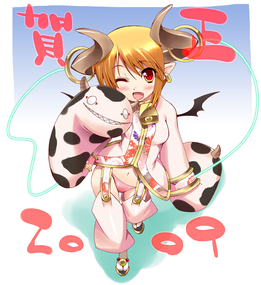 00s1girl2009animal printbat wingsbellblonde hairblushcow printcowbelldemon girlfangfemale focushornsnavelnew yearone eye closedpantiespointy earsred eyesshort hairsolotabiunderwearwingswink