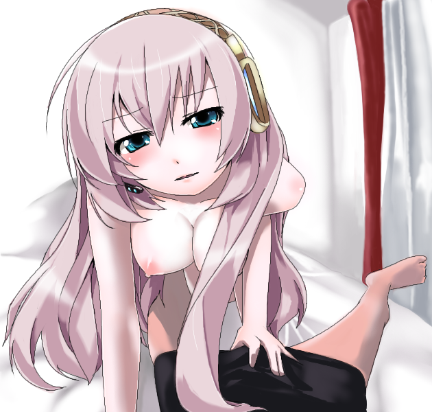 1girlbarefootblue eyesblushbreastsbulgecrotch rubfemale focuslarge breastslong hairnipplesnudeoekakipink hairsolo