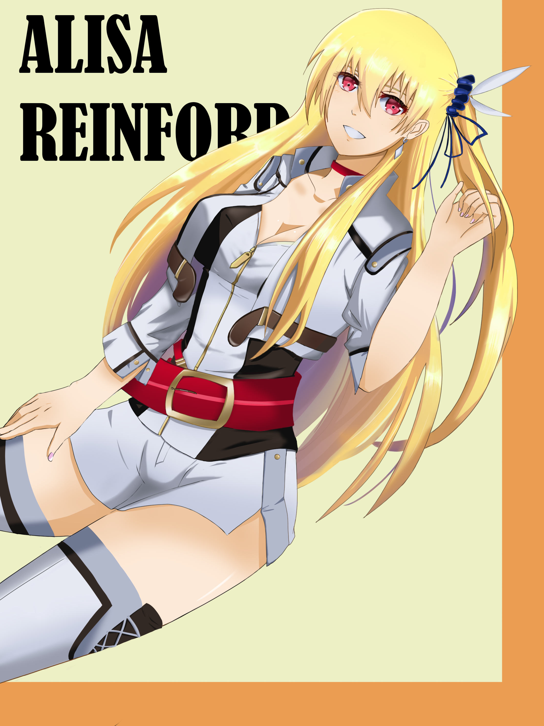 1girlblonde hairborderbreastscleavagecollardouble-parted bangsfeather hair ornamentfeathersgrinhair between eyeshair ornamentlarge breastslong hairlooking at viewerorange borderover-kneehighsparted lipspencil skirtred eyesside ponytailskirtsmilesolospy osakathighhighstwo side uptwo-tone backgroundupper bodyyellow background