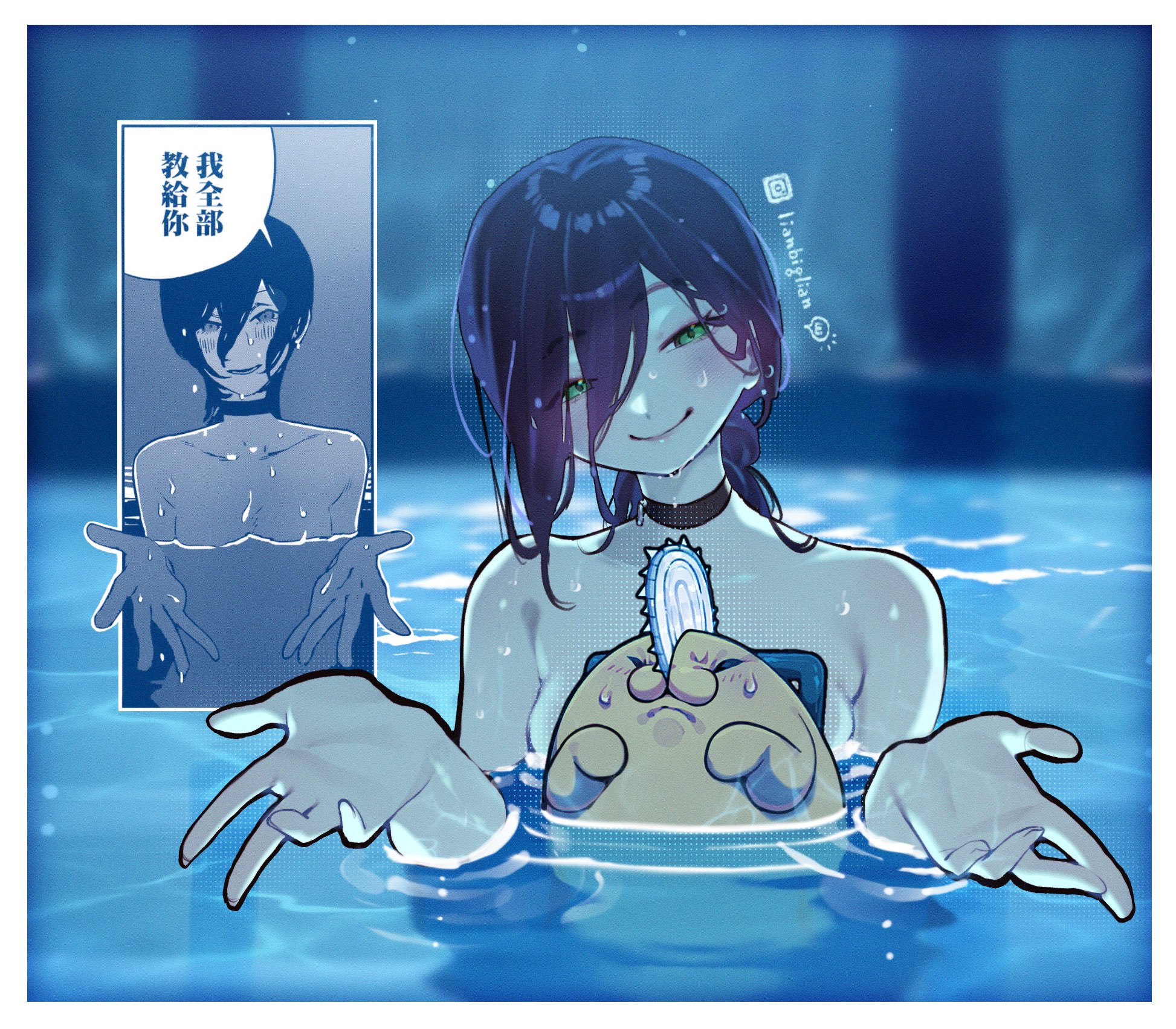 1girlblack chokerblack hairbreastschainsawchokerclosed mouthgreen eyeshair between eyeslooking at viewerpartially submergedpoolsmall breastssmilewetwet hair