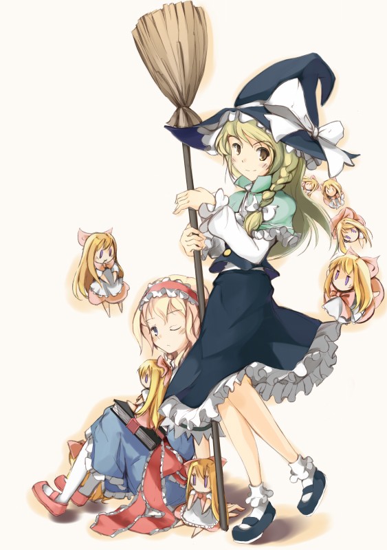 2girlsblonde hairbraidbroomdollfemale focushairbandhatmultiple girlsone eye closedsittingstandingwitchwitch hat
